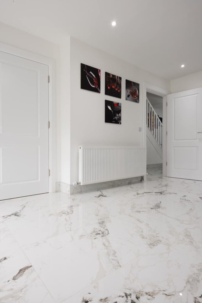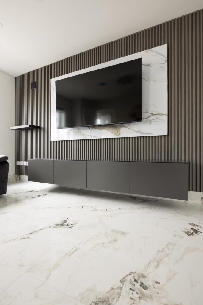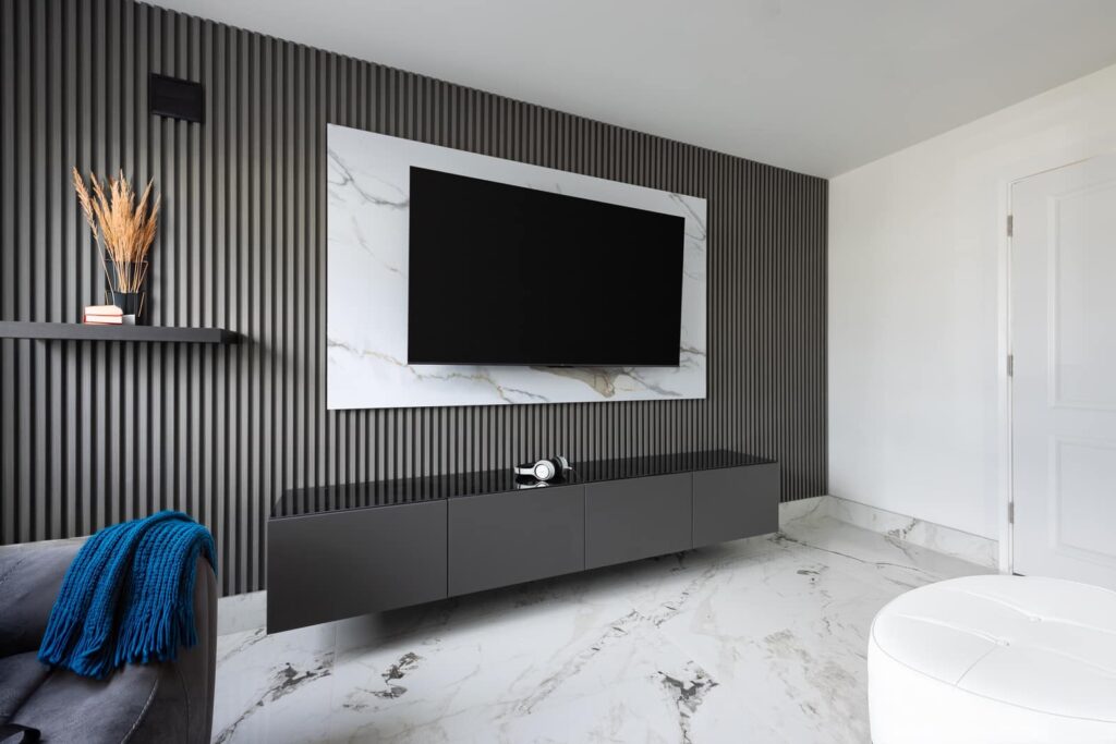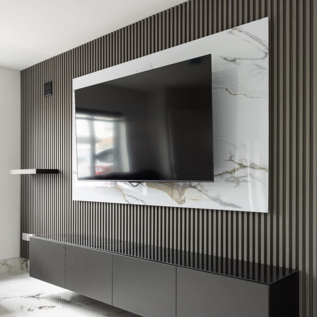 This elegant media wall combines luxury and minimalism — designed with a custom matte floating unit, marble backing, and vertical wood slat paneling for added depth and warmth. Previous Post Modern Kitchen Renovation – Dublin, Ireland Next Post Modern Bathroom Renovation – Dublin, Ireland