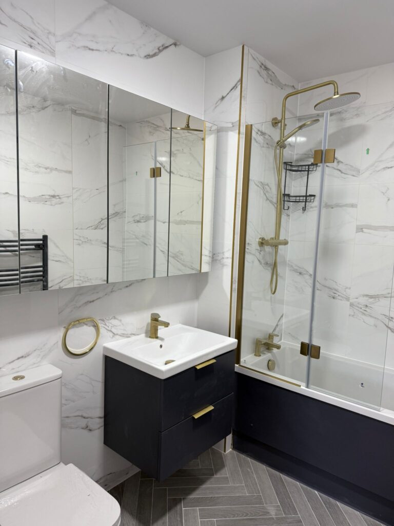This bathroom received a complete upgrade, transforming it into a bright and luxurious space with premium materials and modern gold accents. The combination of marble-effect tiles, herringbone flooring, and matte navy cabinetry creates a sophisticated look while keeping the layout…